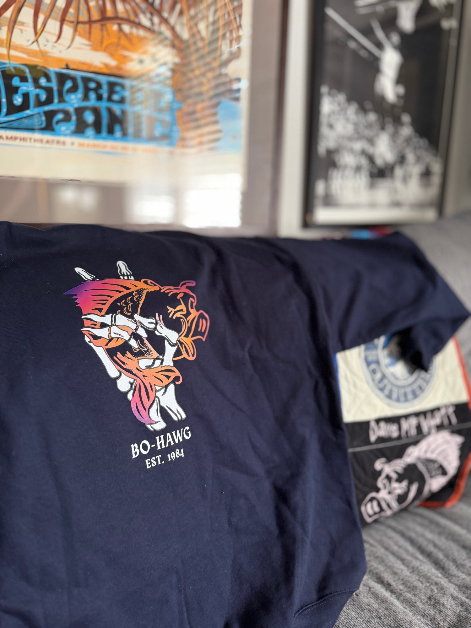 The Bo-Hawg® Laid Back Bones Crewneck is one of those ideas that came together easy. Skeleton and the Pig Fish. No doubt it had to be throwing the peace sign too, because that’s just who we are...and a shoutout to Pops.