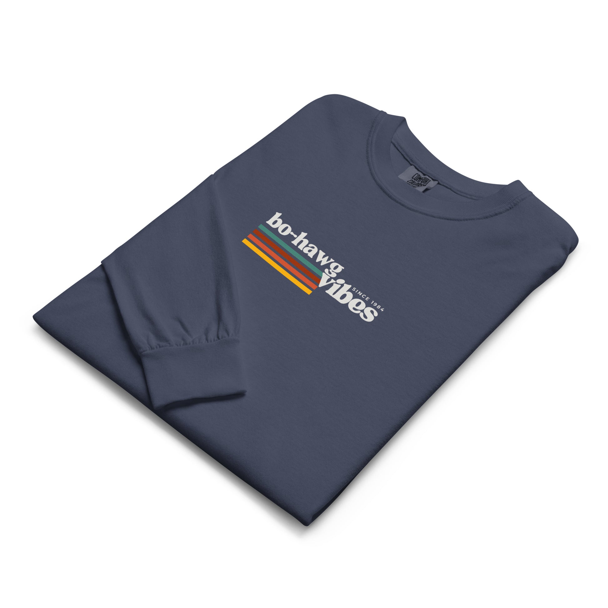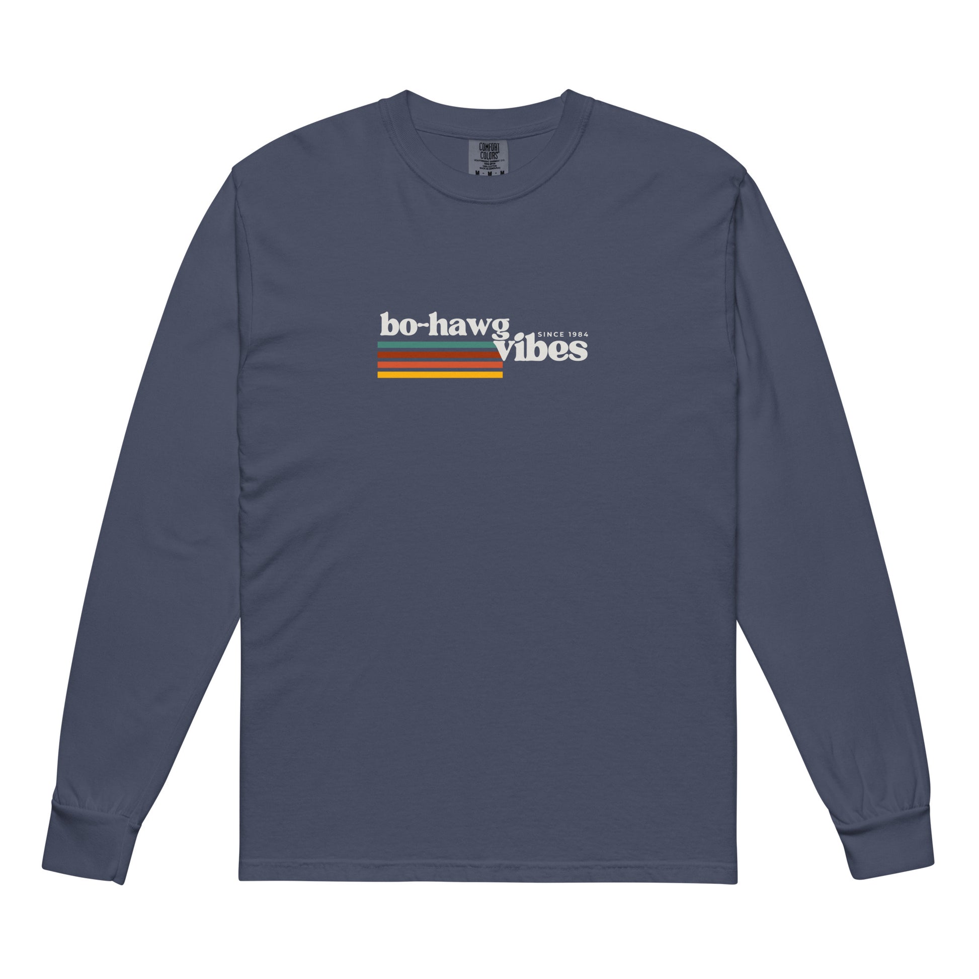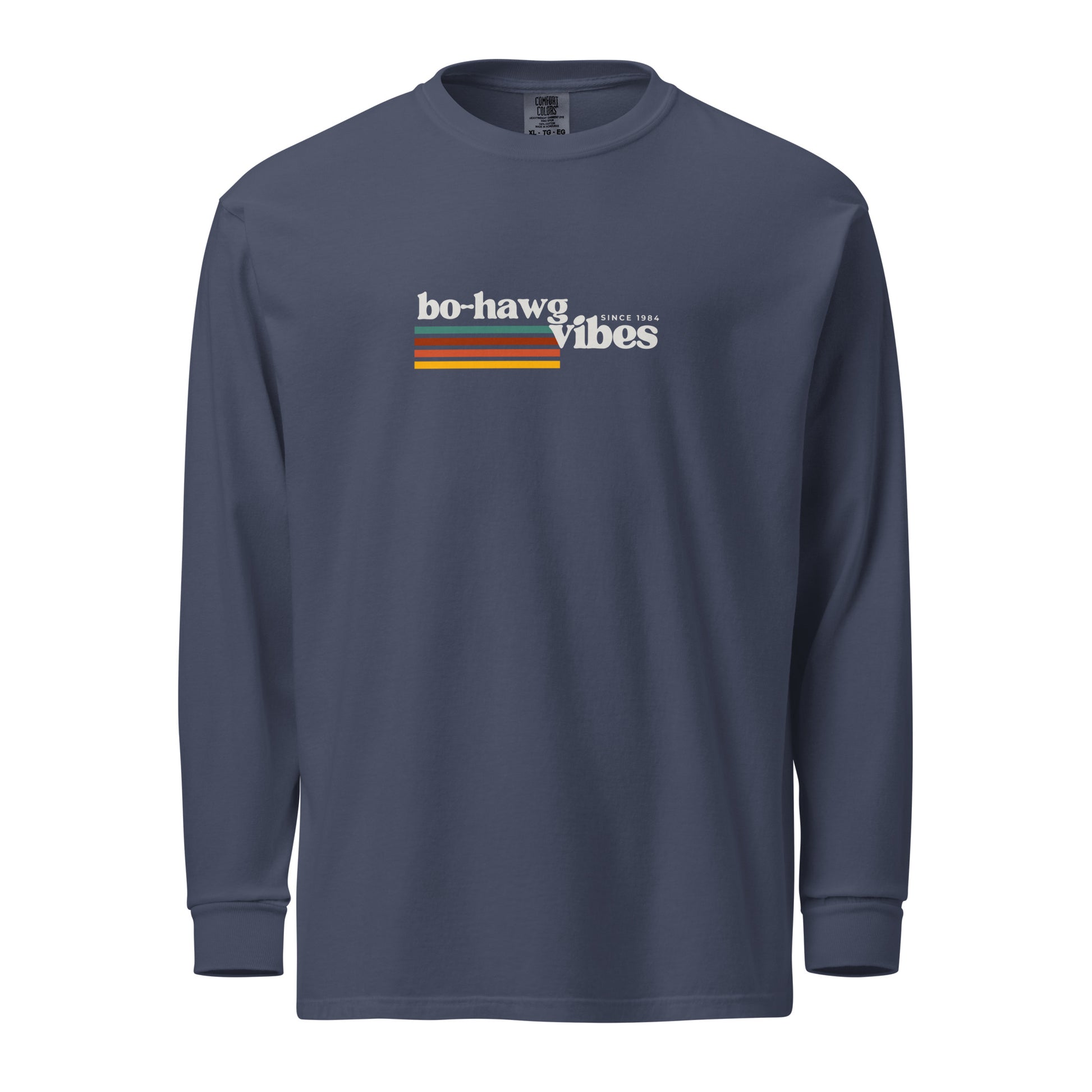 We have been wanting to drop something with a retro soul. One afternoon we found some old shirts hiding at the back of the closet, and came across a Dave Matthews Band tour tee. The fabric, the print, the memory really let us know this had to be a cold weather shirt. Something folks wear hiking under pine trees or sippin’ coffee by the fire or just kicked back at the crib. Bo-Hawg® Vibes Long Sleeve is that moment.